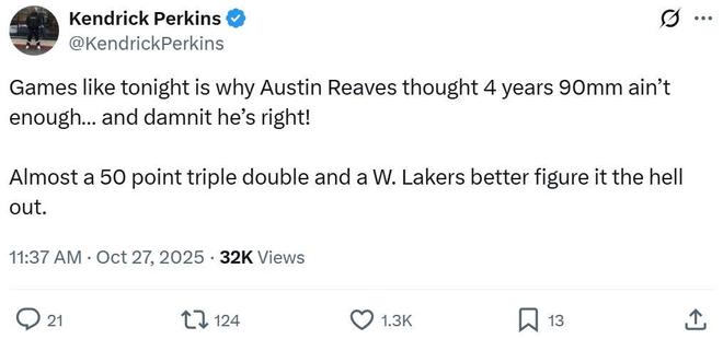 为此,赛后名嘴帕金斯第一时间发声:“这就是他为什么拒绝4年8900万的理由,里夫斯是对的!”