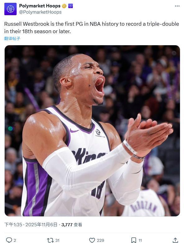 在感叹威少篮板能力的同时,也不得不称赞他对于个人状态的保持,在生涯第18个年头还能拿下三双,成为NBA历史上首位在生涯第18个赛季还能拿下三双的后卫。