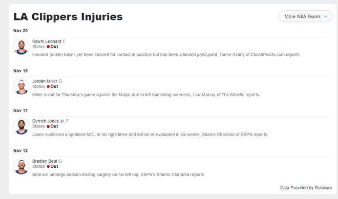 快船的比尔赛季报销,琼斯、米勒、莱昂纳德都伤缺,残阵快船靠哈登一人苦撑。